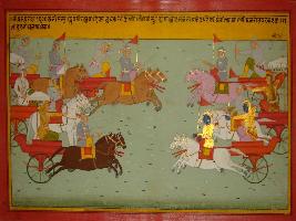 | Description / विवरण | Miniature painting based on Mahabharat - Bhishma parva depicting Abhimanyu and other sons of Draupadi are fighting with Kauravas. On the other hand Shikhandi is fighting with Bhishma and to help Bhishma Duryodhan is coming forward. |