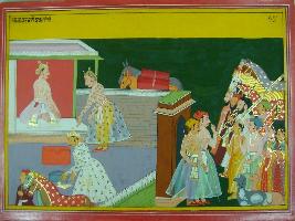 | Description / विवरण | Miniature painting based on Mahabharat - Sabha parva depicting a king visiting a kings place, many horses, men and are women depicted standing out of the gate of the palace. |