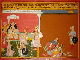 | Description / विवरण | Miniature painting based on Prithviraj Raso depicting Jaichand and Chandvardai in his court depicting the glory of king Prithviraj. |