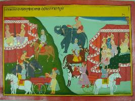 | Description / विवरण | Miniature painting based on Mahabharat - Bhishma parva depicting both of the armies of Kauravas and Pandavas are getting ready in the morning for war. Pandavas and two of the Kauravas seen sitting in their tents. |