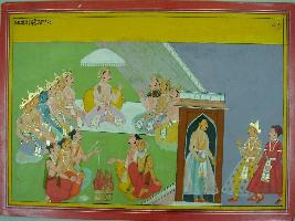 | Description / विवरण | Miniature painting based on Mahabharat - Sabha parva. king Yudhisthuira is depicted in his assembly on the upper part consisting of Pandavas. On the lower part Brahmans depicted performing yagna. |