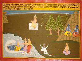 | Description / विवरण | Miniature painting based on Mahabharat - Bhishma parva depicting Duryodhan is asking Bhishma about Krishna. Then Bhishma replied that he is purnabrahma and came to earth as an incarnation of Vishnu. He is the only who created water, air and light and create the earth also. Then he created Brahma and created all creatures on earth. |