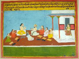 | Description / विवरण | Miniature painting based on Krishna charit. It is on unfinished painting, here one Brahman is shown blessing Krishna and Vasudev. |