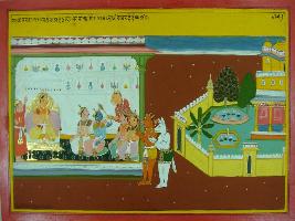 | Description / विवरण | Miniature painting based on Mahabharat - Sabha parva. The painting depicts king Yudhisthir and other Pandavas are sitting in the court and Maya demon come to meet them. |