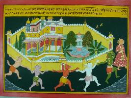 | Description / विवरण | Miniature painting based on Mahabharat - Sabha parva depicting a fort that is surrounded by demons out side, birds are flying in the sky and people are coming for Sabha. |