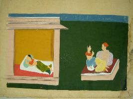 | Description / विवरण | Miniature painting depicting Nayak and Nayika sitting and talking on a couch at the left part. At the right part, Nayika is shown lying on the bed. It is incomplete painting. |