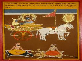 | Description / विवरण | Miniature painting based on Shri Bhagwat Gita. Krishna is telling to Arjun, Arjun sanyas without meditation, Meditation is power of sages, mediator gets Vedas gyan. |