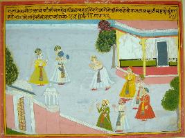 | Description / विवरण | Miniature painting based on Krishna charit depicting Raja Agrasen with his courtesan welcoming Krishna and Balram. |