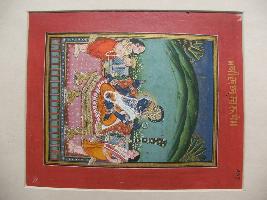| Description / विवरण | It is a painting of Srikrishna. Srikrishna is shown in padmasana. It had four armed. Wheel, mace, lotus and conch is shown in armed. Three cat is shown below. Top Upper part sky, plants natural scenary is shown. One male and female attendant stand |