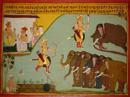 | Description / विवरण | Miniature painting based on Prithviraj Raso depicting Chandvardai with Jaichand in his court. Chandvardai telling Jaichand about the strength and bravery of Prithviraj who can flow a river of blood and kill 7 elephants by a single arrow. |