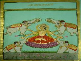 | Description / विवरण | Miniature painting depicts the four handed Sri Kamala murti sitting on lotus and guarded by four elephants. |