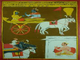 | Description / विवरण | Miniature painting based on Shri Bhagwat Gita. It depicts Krishna preaching Arjun that in anyplace Bhagwan in exist and this painting is made in the time of Jai Singh. |