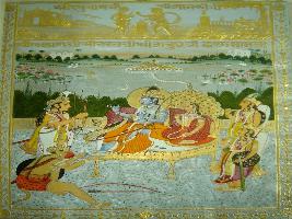 | Description / विवरण | Miniature painting depicting Ram and Sita sitting on throne and in both side of him Lakshman Bharat. Shatrughana and Hanuman is seen. |