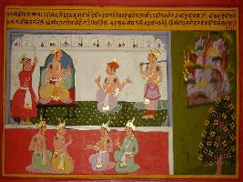 | Description / विवरण | Miniature painting based on Prithviraj Raso depicting Jaichand s court scene, into two panels. On the left hand side a burning mountain is depicted. |
