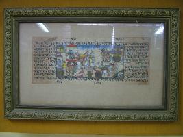 | Description / विवरण | It s a Mahabharat granth paper. It s a scene of Mahabharat war. Arjun and other soldiers s charriot are painted in multicolour in centre of paper. It has manuscript in Sanskrit language all over it with black and red ink. Horses are ornamented |