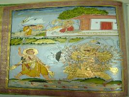 | Description / विवरण | Miniature painting depicting a fighting seen of Parasurama and Sahastrajuna while on top Parasurama is seen that take blessings from his parents. |