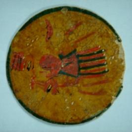 | Description / विवरण | Circular flat ganjifa depicting a horse with rider on yellow background and other side is plain. |