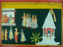 | Description / विवरण | Miniature painting based on Mahabharat - Sabha parva depicting Krishna coming to Yudhisthir and touching his feat then he meet all four Pandavas and then goes to Draupadi. |