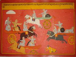 | Description / विवरण | Miniature painting based on Mahabharat - Bhishma parva depicting arrow of Nandak hit Bhim and makes him unconscious, seeing which Abhimanyu come forward to help him. |