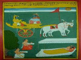 | Description / विवरण | Miniature painting based on Shri Bhagwat Gita. It depicts Krishna preaching Arjun that Brahma is important in Samveda and Gayatri is important in mantras in same way Vasant is important in seasons. |