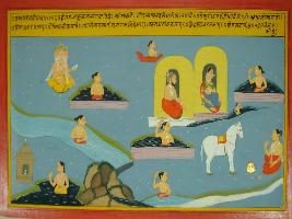 | Description / विवरण | Miniature painting based on Mahabharat - Vana parva. The painting depicts about the importance of visit the holy places and taking bath in that place where Ganga and Yamuna meet together. |