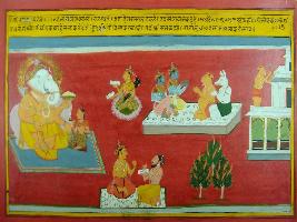 | Description / विवरण | Miniature painting based on Mahabharat - Sabha parva depicting Arjun meeting demon Mai, Mai praising him self that he has got the power like fire then Arjun ask Mai to built a Sabha for Yudhisthir. |