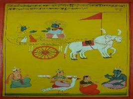 | Description / विवरण | Miniature painting based on Shri Bhagwat Gita. It depicts Krishna preaching Arjun that mother has been created by God for procreation Dhriti, Samrity, Kriti and Saraswati are first few mothers created. |