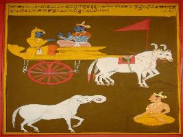 | Description / विवरण | Miniature painting based on Shri Bhagwat Gita. It depicts Krishna preaching Arjun about his form in sense of Ram, Devtas fish, elephant etc. |