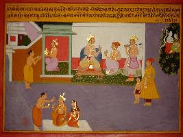 | Description / विवरण | Miniature painting based on Prithviraj Raso depicting court of Jaichand in the centre and Kamdev and Rati seated on a tree. |