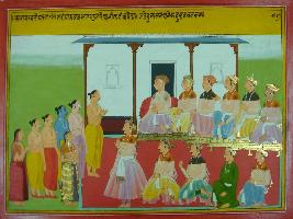 | Description / विवरण | Miniature painting based on Mahabharat - Sabha parva depicting Pandavas after changing their cloths asking permission from Dhritrashtra to go to the forest. Hearing which Dushasana insulting the Pandavas. Bhishma and other nobles and Kaurav princes are listening to them. |