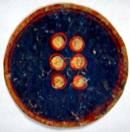 | Description / विवरण | Circular flat ganjifa depicting six balls on green background. The other side is plain. |