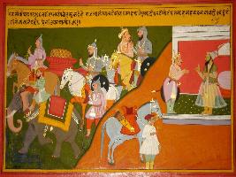 | Description / विवरण | Miniature painting based on Prithviraj Raso depicting Panga telling Jaichand that king Anangapala going to meet Mohammad Ghauri, who agreed to help him and marching towards Delhi with his army. |