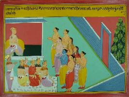 | Description / विवरण | Miniature painting based on Mahabharat - Sabha parva depicting after paying namaskara to king Somadatta and king Bahlik Pandavas moves towards to forest. Then Vidur says that Kunti will stay in his house. |