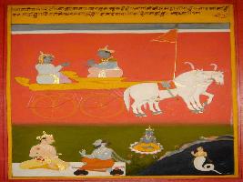 | Description / विवरण | Miniature painting based on Shri Bhagwat Gita. It depicts Krishna preaching Arjun that he is Sheshnaag among all snakes as fast as Varun and he is yam also. |