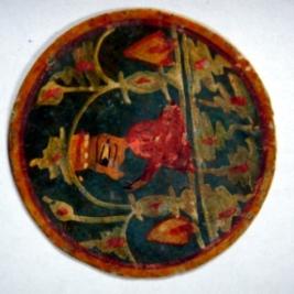 | Description / विवरण | Circular flat ganjifa depicting a seated man on green back ground on one side and other side is plain. |