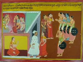 | Description / विवरण | Miniature painting based on Mahabharat - Sabha parva depicting women are crying at the upper right part. Pandavas are shown coming and meeting Kunti, Ganhari and Vidur before going to vana. Kunti stays with Vidur after giving them blessing. |
