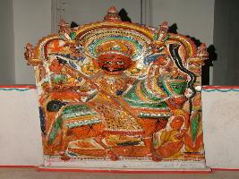 | Description / विवरण | It s a clay sculpture of local deity Ramdevji . Ramdev ji front sive view. Ramdev ji is sitting on a horse holding a Bhala . Background painted in peacock and flower s and leaves. All over sculpture is painted in multi colour. |