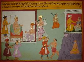 | Description / विवरण | Miniature painting based on Prithviraj Raso. king Jaichand talking to Chandvardai. One man is depicted beating a man with stick, a man holding veena and another man is depicted talking to a woman and a sage is doing penance. |