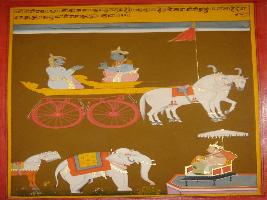 | Description / विवरण | Miniature painting based on Shri Bhagwat Gita depicting Krishna preaching Arjun that he is chaitrawa among horses, Airavat in elephant and king in all human being. |