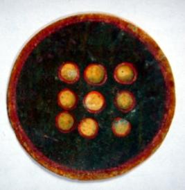 | Description / विवरण | Circular flat ganjifa depicting nine balls on green back ground on one side and other side is plain. |