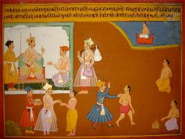 | Description / विवरण | Miniature painting based on Prithviraj Raso depicting Chandvardai telling king Jaichand about three status of a man. And says that with kingdom only these three exists. He also tells him about wealth and dharma. |