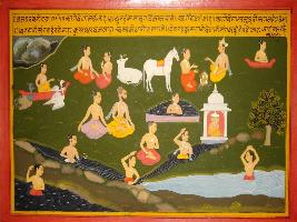 | Description / विवरण | Miniature painting based on Mahabharat - Vana parva. The painting refer about the holy place Godavari which is started in the bank of the river Ganga and also depicts its importance as a holy place. On the painting some pries and one depicts who are worshipping and taking bath in the Ganga. |