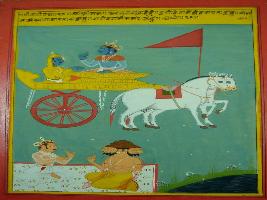 | Description / विवरण | Miniature painting based on Shri Bhagwat Gita. It depicts Krishna preaching Arjun that Brihaspati is best among Purohit, Swami Kartik is best among commander in chief and sea is best among lakes. |