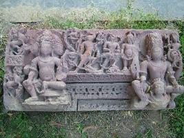 | Description / विवरण | It is a sculptural plaque, having Brahma the three faced god shown in lalitasana in one side while four armed Vishnu sitted on Garuda in lalitasana on either side. On top Varah, Nrisimha and vamana are carved out. |
