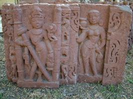 | Description / विवरण | It is a sculpture of Vishnu, shown in tribhanga; the four armed god is shown holding a mace, a kamandalu, chacra while fourth in varada mudra, is carved in tribhanga flanked by female attendant. |
