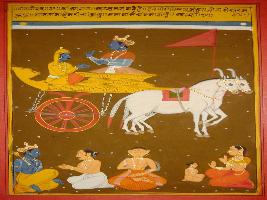 | Description / विवरण | Miniature painting based on Shri Bhagwat Gita. It depicts Krishna preaching Arjun that he is Vishnu among all gods, Sun among illuminations. Marichi among all illusions and Chandrama among all heavenly bodies. |