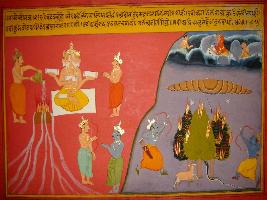 | Description / विवरण | Miniature painting based on Prithviraj Raso depicting Chandvardai telling Jaichand about king Satkirti who performed a yagna for Agni and Agni in fear hide in Khandav van and at last Arjun rescued him and Agni gave him a bow in return. |