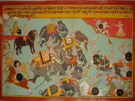 | Description / विवरण | Miniature painting based on Mahabharat - Bhishma parva depicting Duryodhan is accompanied by the king of Magadh with 10,000 elephants and on the other hand Bhim is attacking on the elephants and son of Draupadi and Nakul is helping him. |
