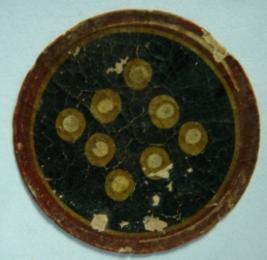 | Description / विवरण | Circular flat ganjifa playing card depicting eight circles on black background. The other side is plain. |