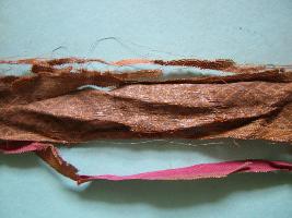 | Description / विवरण | This rectangular zari border from Surat is done with gold embroidery on red ground. Its pattern is of oblique stripes of two rhombus-shaped marks bordered with vertical waves between four light green lines. |